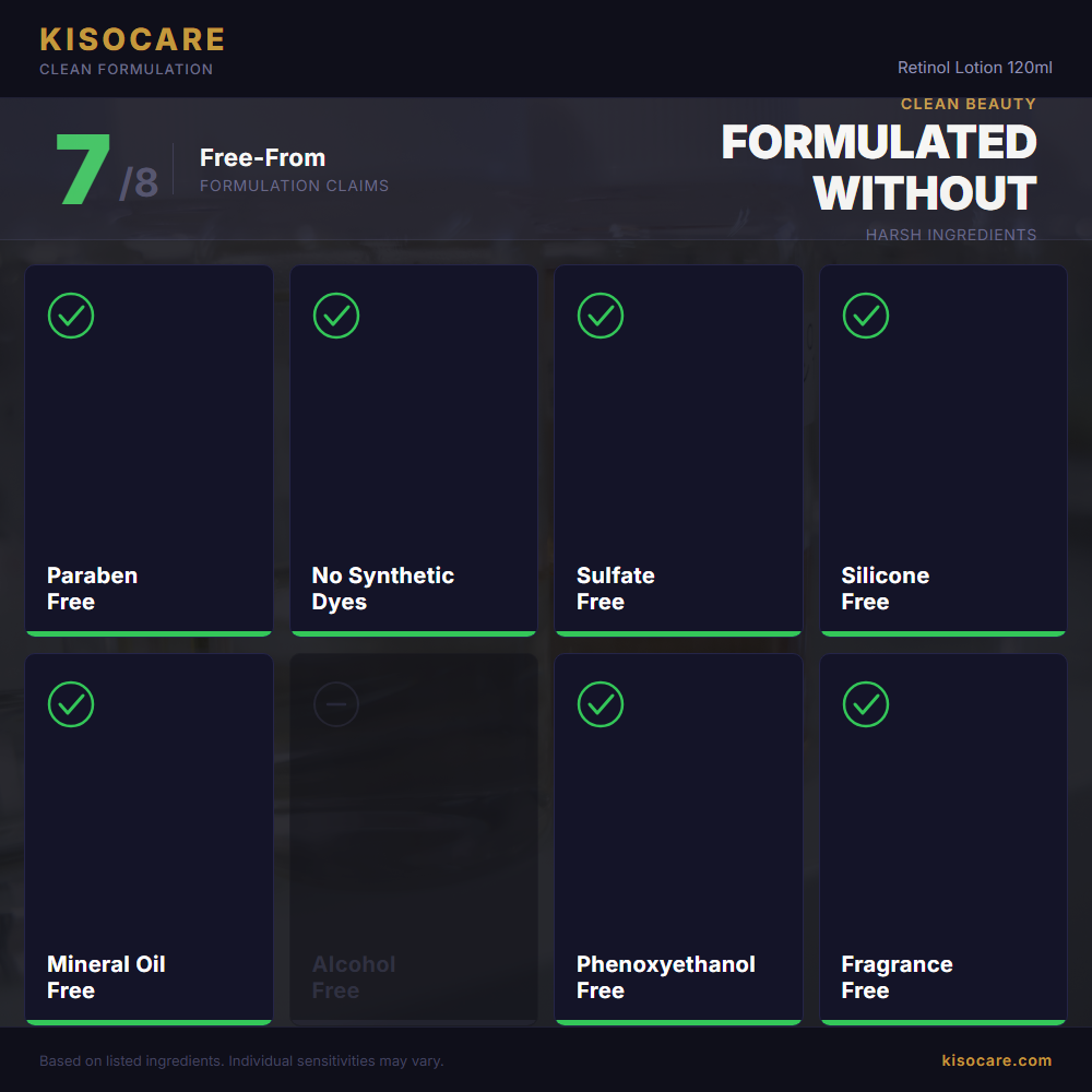 Paraben-free / Synthetic fragrance-free / Artificial coloring-free / Silicon-free / Petroleum-based alcohol-free / Petroleum-based surfactant-free / Mineral oil-free / UV absorber-free